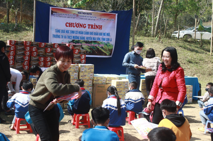 Ông Trần Văn Học, Phó chủ tịch Hội KH&KT về TCCL Việt Nam và Bà Đặng Thị Kim Hiên, Bí thư Chi bộ cơ quan Hội KH&KT về TC và CL Việt Nam, Ủy viên Ban Thường vụ Hội KH&KT về TC và CL Việt Nam, Tổng biên tập Tạp chí Chất lượng và cuộc sống trao mì tôm cho Trường TH và THCS Mường Bằng